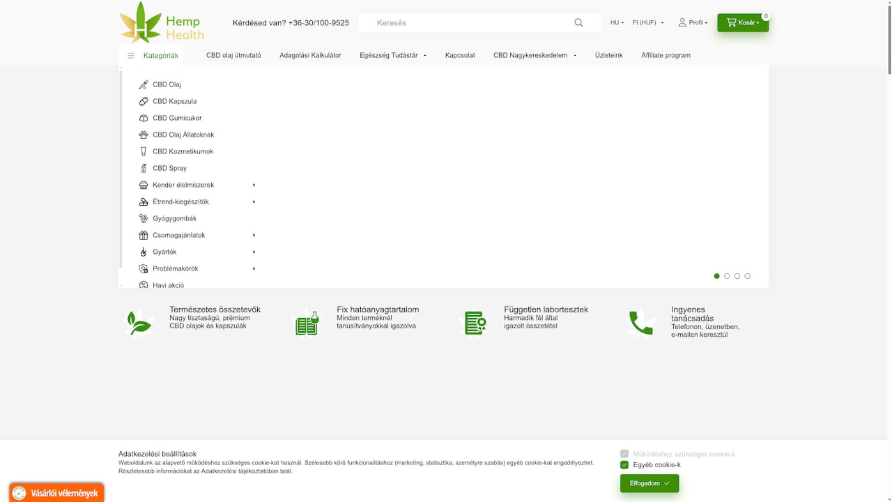 A kínálatban találhatóak teljes spektrumú és THC-mentes olajok, kapszulák, kozmetikumok és állatbarát termékek. Minden termékhez járó független laborteszt növeli a bizalmat és a transzparenciát. A termékek fix hatóanyagtartalommal érkeznek és természetes összetevőkre épülnek. Emellett ingyenes tanácsadás érhető el telefonon, e-mailben és személyesen.
