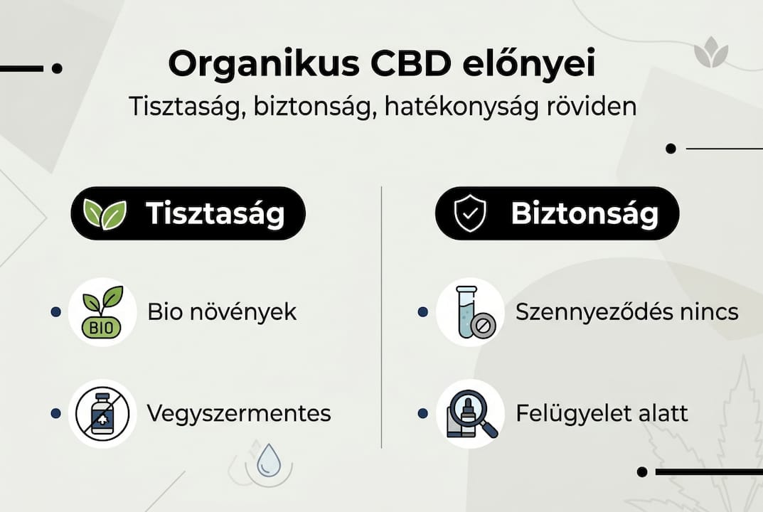 | Organikus CBD tisztasága | Bio kenderből készül, szennyeződésmentes, kevesebb egészségügyi rizikóval. |